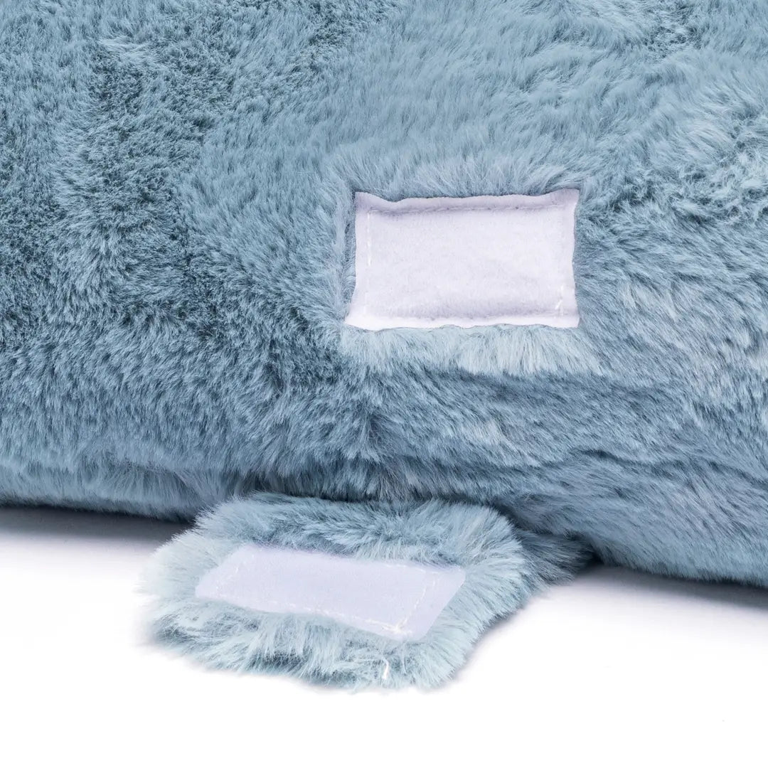 Its soft blue exterior and floppy arms create a lovable presence that feels more like a companion than a tool. Inside, a secure safety bag keeps the weighted filling neatly contained, while a strong Velcro closure ensures everything stays in place.